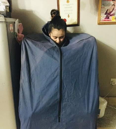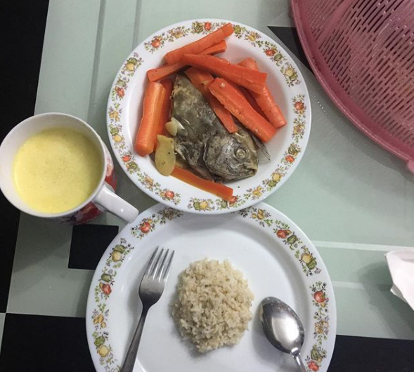 Beliau berkongsi menu berpantang tengah hari tadi di instagram. Beliau juga turut berkongsi aktiviti berpantang iaitu bersauna untuk menjayakan misi kurusnya itu.