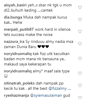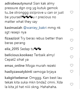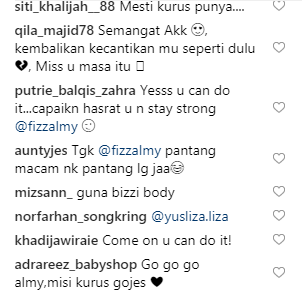 Ramai netizen yang memberikan sokongan kepada Almy Nadia. Mereka memberikan kata-kata semangat supaya Almy Nadia mendapatkan kembali bentuk badan zaman anak daranya itu.