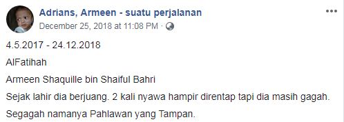 Doktor yang merawat menganggarkan usia anaknya bertahan sehingga 3 tahun, tapi si kecil Armeen pergi ke syurga abadi lebih awal dari itu.