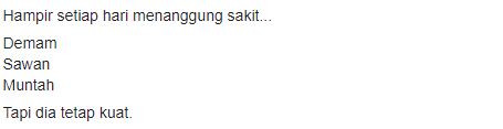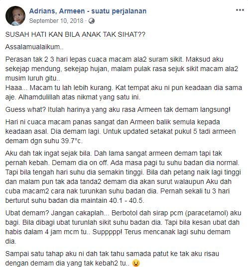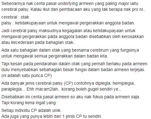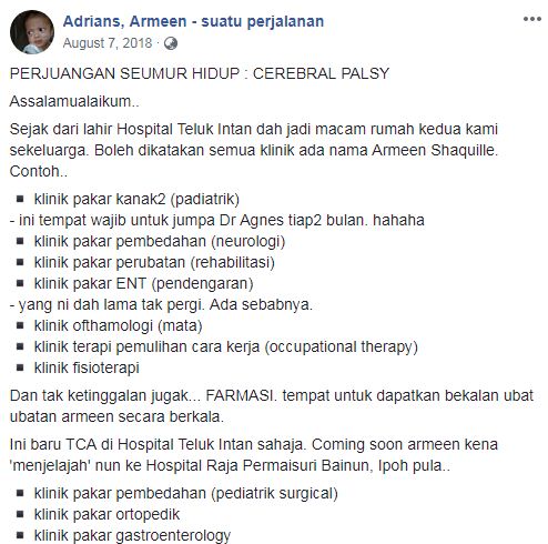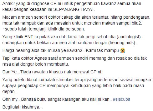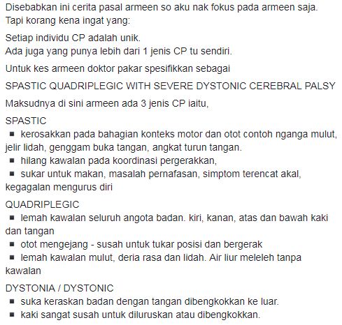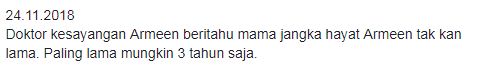 Ibu ini juga turut berkongsi catatan tentang keadaan yang dialami oleh Allahyarham Armeen Shaquille. Ia disifatkan oleh ibu ini sebagai perjuangan seumur hidup.