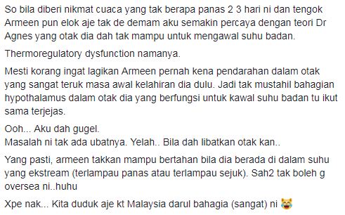 Puan Wan Azalina juga turut berkongsi sedikit sebanyak info mengenai keadaan kesihatan Allahyarham Armeen. Salah satunya ialah tentang demam suhu tinggi 40.1º hingga 40.5º Celcius apabila cuaca terlalu panas. Pemberian sirap paracetamol tidak membantu untuk kebah. Setelah diselidiki, rupa-rupanya ia tidak boleh diubati kerana demam masalah Thermoregulatory dysfunction mungkin disebabkan oleh pendarahan otak yang dialami anaknya ketika dilahirkan dulu.