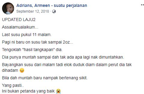 Ibu ini juga turut berkongsi bagaimana Allahyarham Armeen tidak dapat memproses susu yang diminum. Apabila dikeluarkan (disedut keluar menggunakan mesin khas), barulah dia lega dan boleh tidur. Menurut ibu ini, ia adalah petanda yang tidak baik bagi kesihatan Armeen.